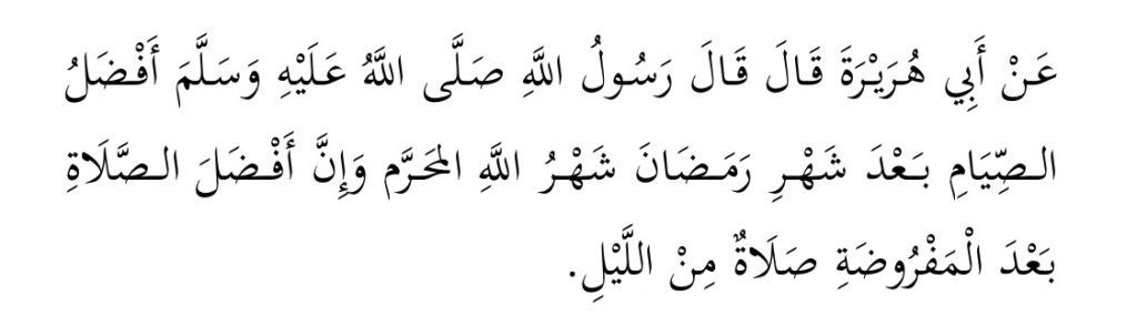 Abu Hurayrah reported that the Messenger of Allah (ﷺ) said, “The best month for observing siyam after Ramadan is Al-Muharram, and the best prayer after the prescribed salah is prayer at night.”[1]